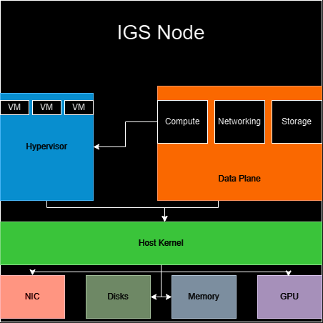 In this diagram, we see an IGS node that represents a server with several different components. We have various hardware resources like memory, NICs, disks, and GPUs. For the server’s operating system, we are using Ubuntu and that serves as the main coordinator for us being able to reach the hardware devices. We have a data plane which is what IGS represents currently, and that program talks to a hypervisor, in this case KVM, using QEMU for interfacing it and it talks to kernel in order to provision currently supported hardware, which are NICs and disks, currently.